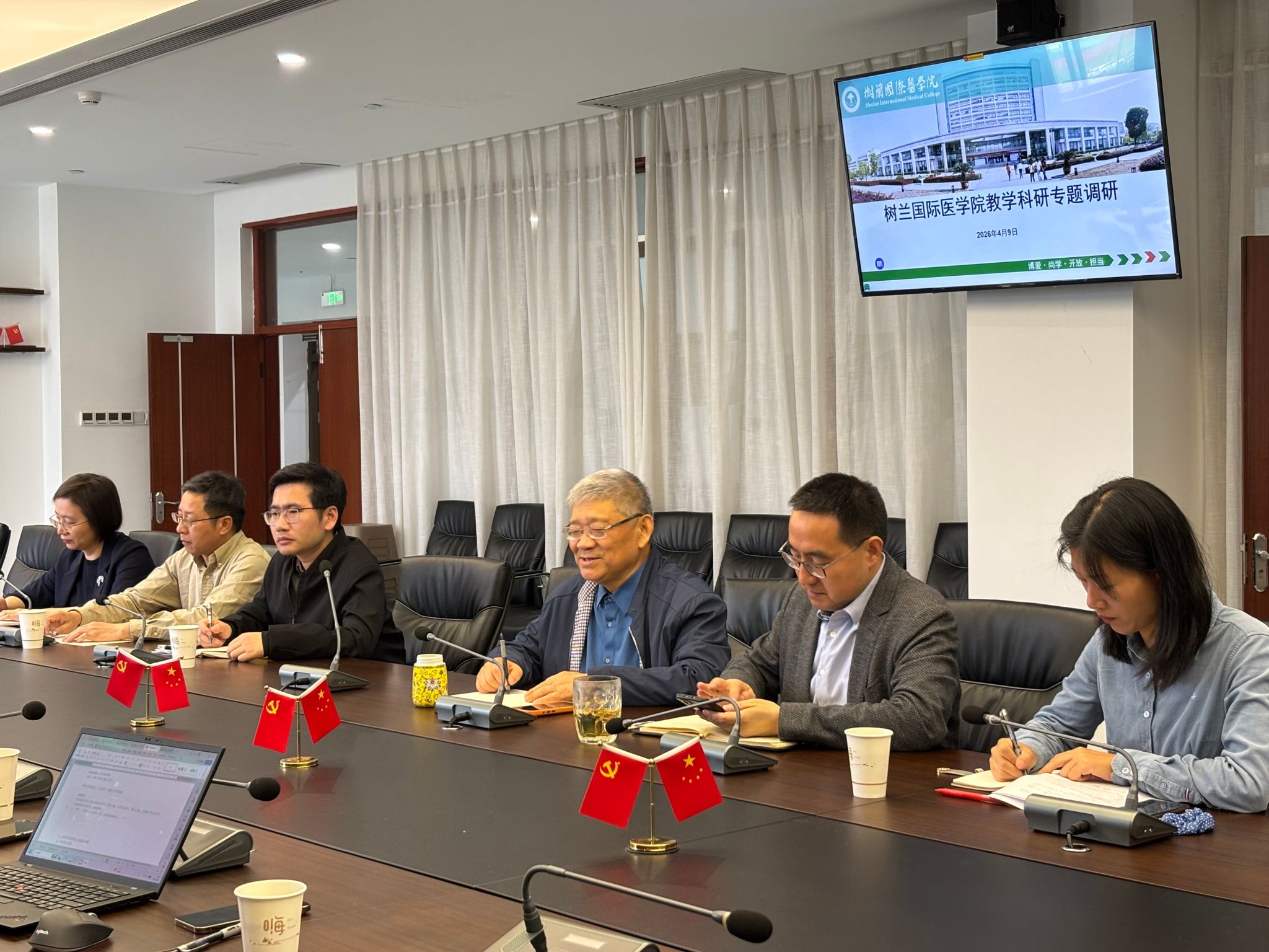 为深化教学科研协同育人机制,优化人才培养路径,全面提升专业建设水平,学校执行校长章清、总督学陈新民、教务处处长姜文杰、质控中心主任王章权、科研处处长潘华、校办党务秘书卞小莉一行于4月9日上午来院专题调研学院发展工作。树兰国际医学院党政班子成员、各基层教学组织负责人参会。